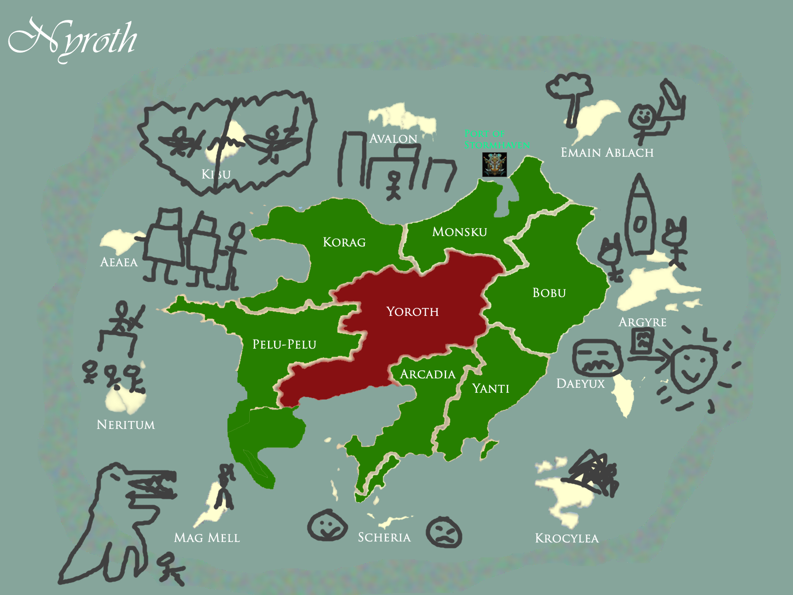 Nyroth is surrounded by ten islands, each containing a nexus. Nyroth appears to be situated atop a leyline convergence, with these island nexuses channeling the wild energy of the magical storms in this region of the ocean inward to the center of Nyroth, where an enormous nexus is believed to be. It seems that, until the cataclysm triggered by Valoran’s Rune Wars, this configuration not only kept Nyroth safe but created a stable thaumic matrix allowing the creation of remarkable hextech inventions that would not otherwise be possible. The map above features crude annotations of each island, added by the ancient Nyrothian discovered by the Freljord.