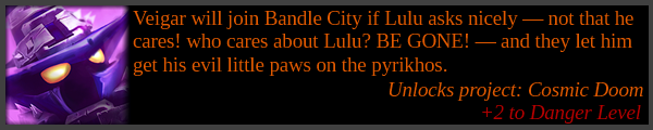 Void Decontamination. Bandle City could, if it’s willing to take on the risk, engage in some dangerous experimentation with pyrikhos and the Void ooze currently contaminating Noxian land, searching for a way to reverse the process. This would launch the Void Decontamination project, but raise Bandle City’s Danger Level by +2.