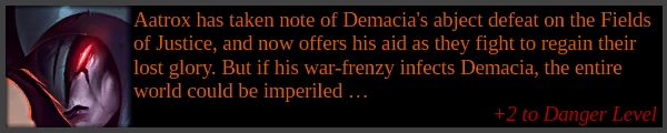 Summon Aatrox. Demacia could summon Aatrox to help rally its cause, as a second new Champion. Desperate times call for desperate measures, but many say that they would rather see Piltover triumph than turn to Aatrox, who not long ago lent his sword to the Void both on and off the Fields of Justice. Summoning Aatrox would increase Demacia’s Danger Level by 2, and could ultimately corrupt Demacia’s noble cause.