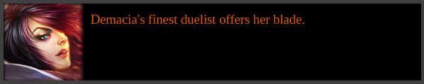 Demacia is not pursuing pyrikhos research, but their considerable political power allows them to potentially draw from a wide range of Champions. They can select one of the following Champions to join their roster.