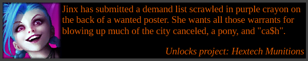 Zaun has two starting projects. The HexKorps is a plan for a new hextech army that could rival the might of Demacia. Pharmakon II is a potent arcano-elixir concocted using both pyrikhos and Void ooze from Noxus, which could be used to create a new breed of sorcerer.