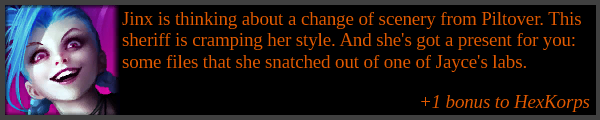 HexKorps Extreme Measures (HKEM). The HexKorps program could be expanded with the HKEM project, giving Singed free reign to mass produce the strategic bioweapons that Noxus has deployed on a smaller scale in previous conflicts. There would be a +1 increase to Danger Level associated with letting Singed run a major project like this.
