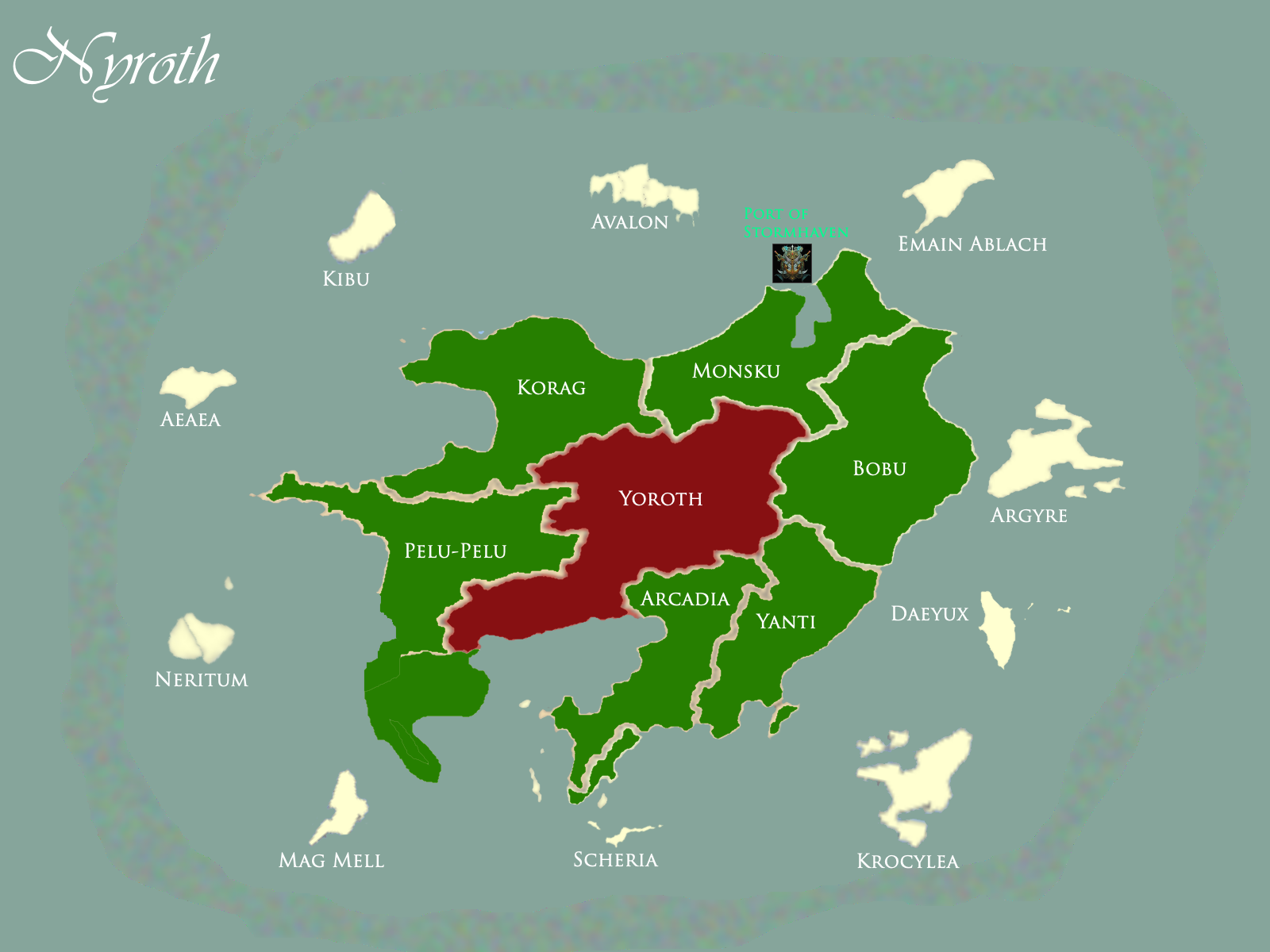 The continent of Nyroth, located to the west of Valoran amidst a turbulent sea wracked by magical storms, is surrounded by an illusion field that until now has hidden it from sight.